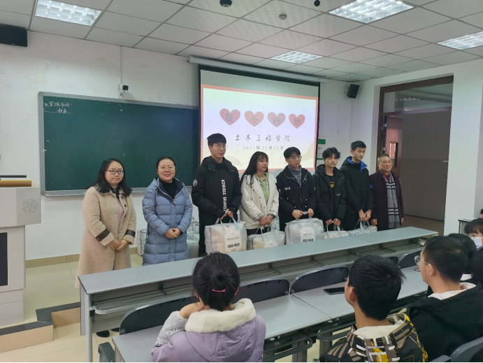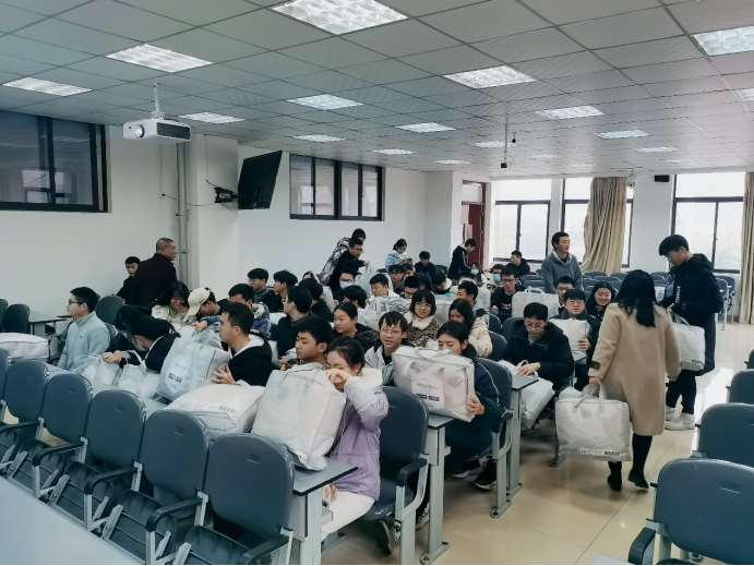 活动伊始,赵中国给与了同学们祝福和鼓励。同时,为了更好地帮助同学,建设更温暖的土木大家庭,学院今后会广泛地征求同学们的意见,不断优化完善帮扶行动措施。而后,党委办公室老师向同学们展示了暖冬物品——绒毛毯。无论是店家,还是毛毯的厚度、大小与颜色,都经过了学院的精心挑选和细心考虑。最后,三位老师携工作人员一起为同学们送上毛毯。一条毛毯,将捂暖整个冬天。